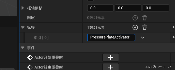 这样一个压力板就只能由角色触发了,如果还想要别的角色也能触发这个压力板(比如一个椅子),只需在椅子的细节面板给椅子加上一个Actor标签"PressurePlateActivator",注意不是组件标签,别搞错了.