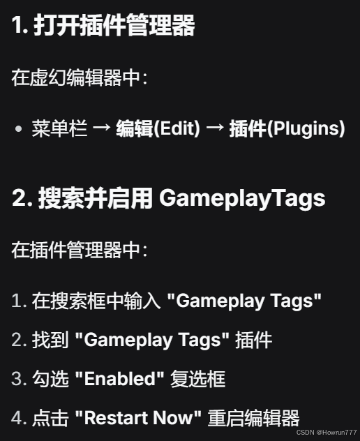 想要使用这个Gameplay Tags:1.必须要先打开此插件 2.在cpp文件中包含头文件 3.在 YourProject/Config/目录下的DefaultGameplayTags.ini文件中定义所有的要使用的标签 4.未定义的标签传入RequestGameplayTag()函数返回的FGameplayTag是无效的.
