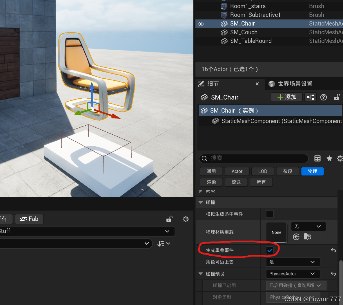 然后还要开启椅子的生成重叠事件,不然椅子无法触发OnComponentBeginOverlap委托和OnComponentEndOverlap委托,也就无法传达椅子和压力板的碰撞行为.