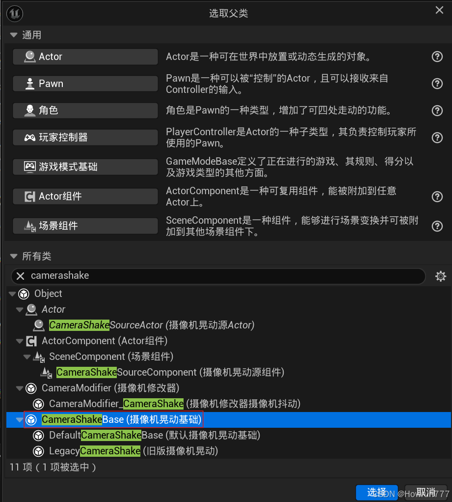步骤1: 创建一个蓝图, 继承自CameraShakeBase类,命名为:BP_HitCameraShake