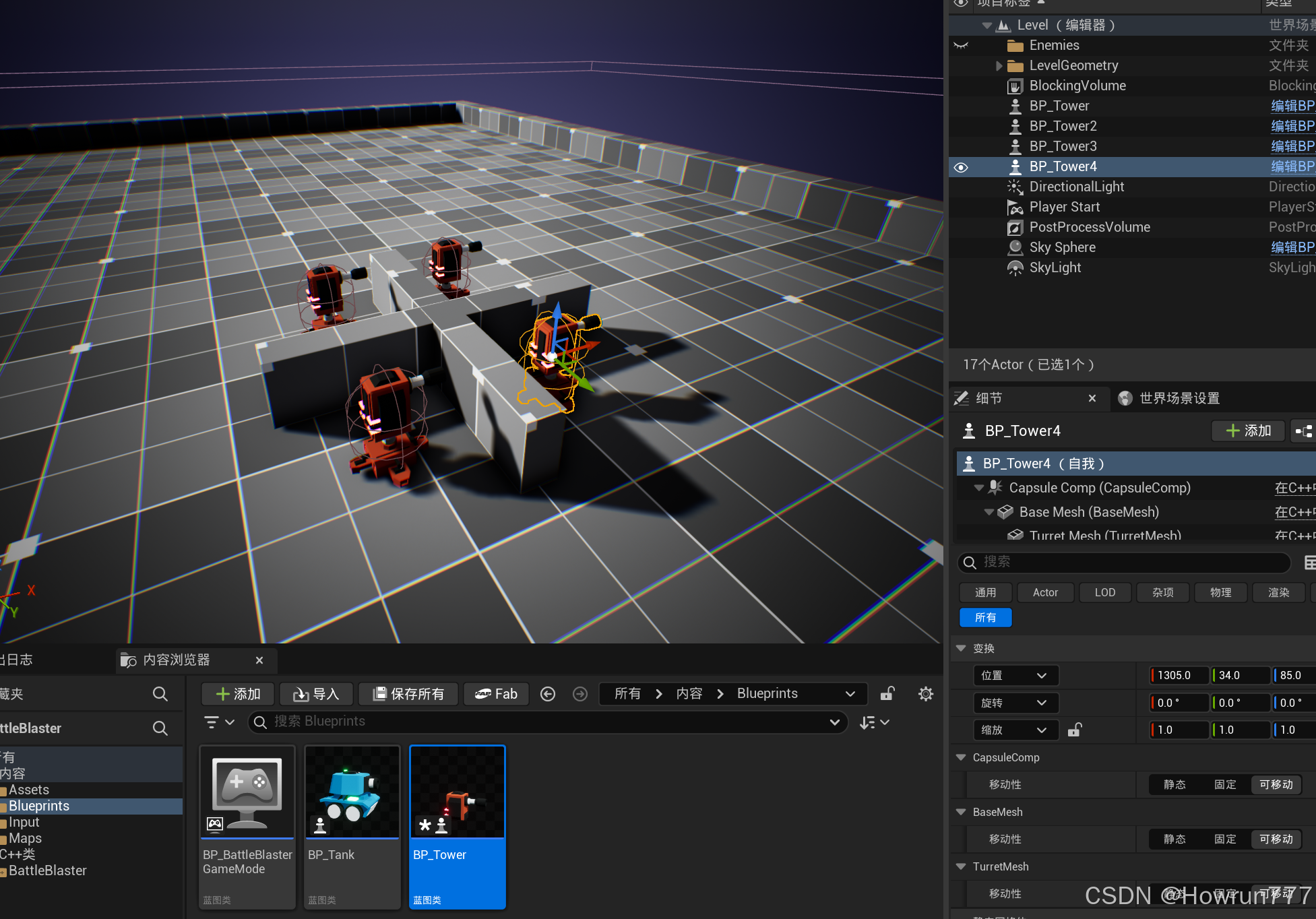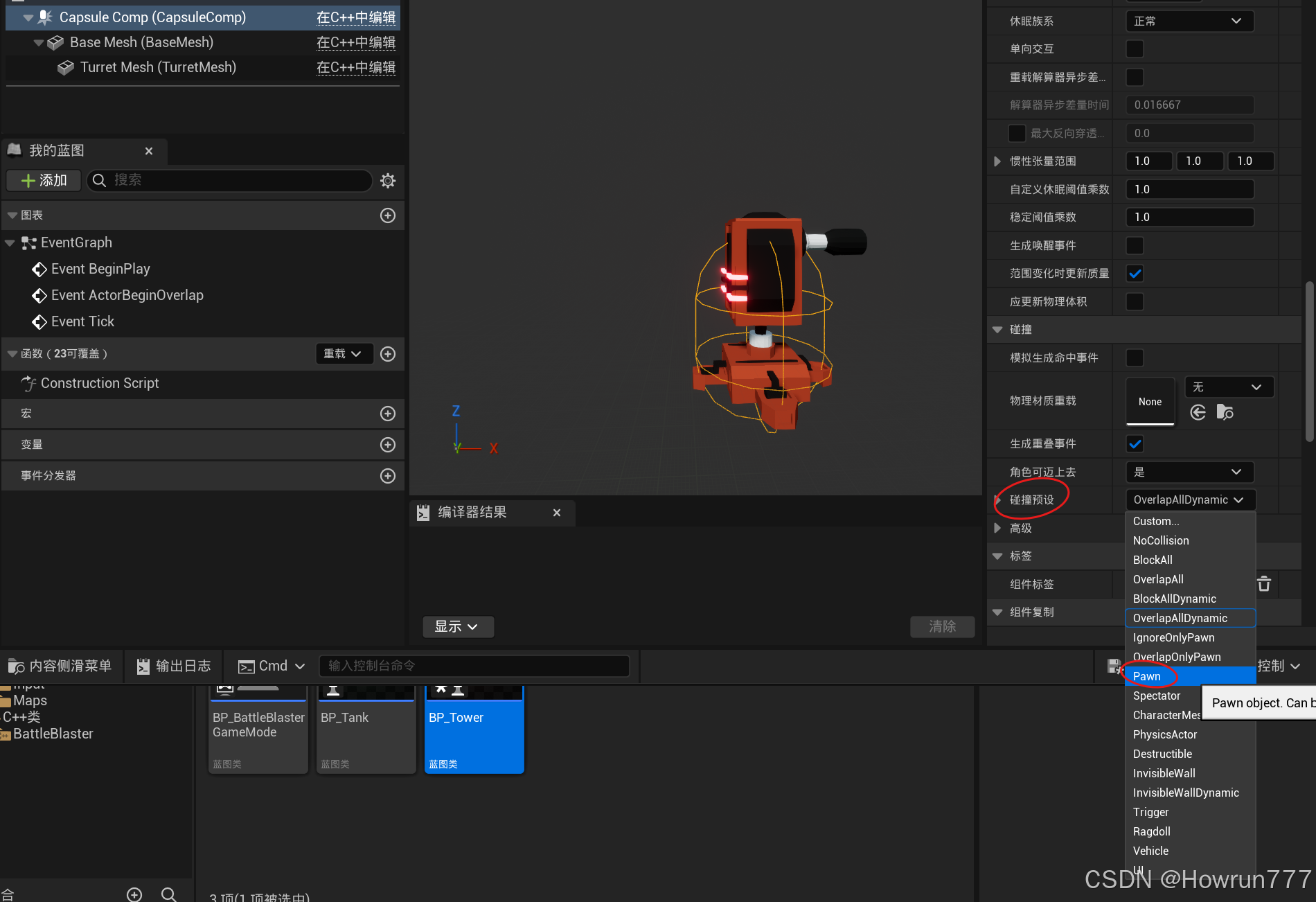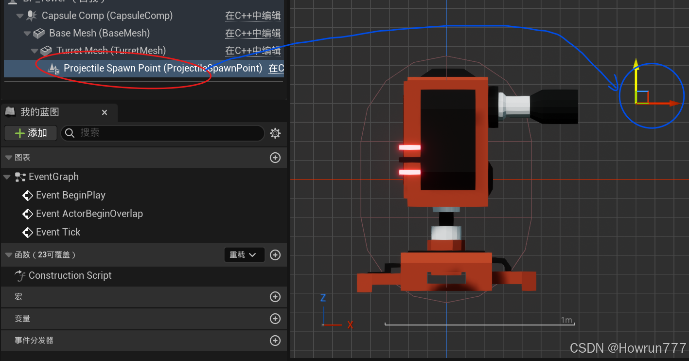 碰撞体: 它定义了这个Actor在游戏世界中的物理边界,用于检测与其他物体的碰撞(如子弹打到炮塔)或重叠(如玩家进入警戒范围)。