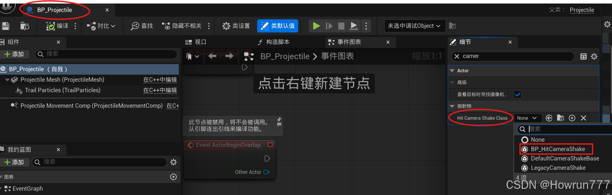 步骤4: 在BP_Projectile蓝图中挂在, 我们定义的相机抖动蓝图