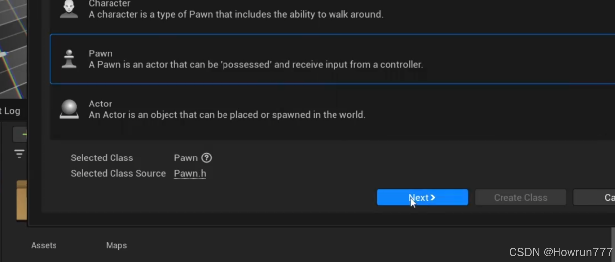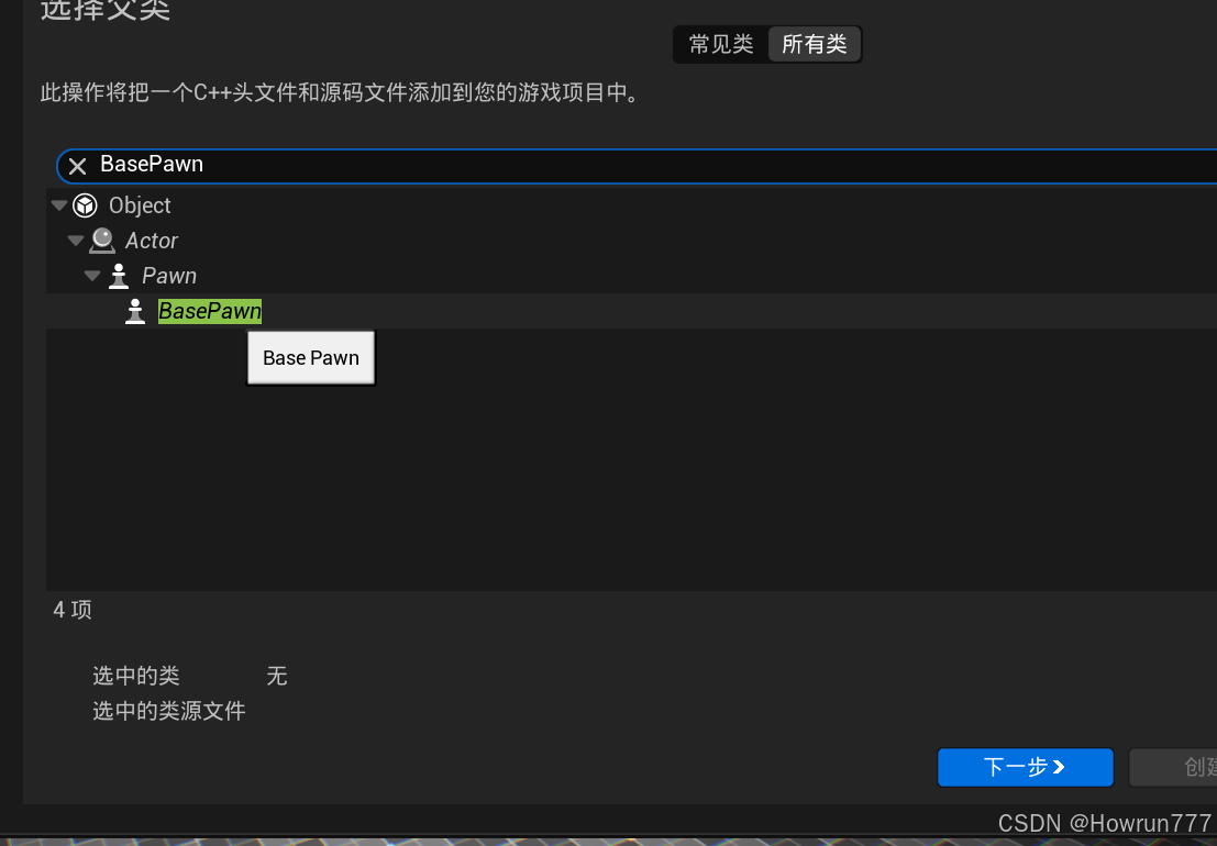 点击左上角工具-新建C++类,我们选择继承自Pawn类,命名为BasePawn