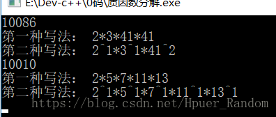 本文介绍了一种将整数分解为其质因数及其幂次的算法,并提供了两种输出格式:一种是以连续质因数的形式展示,另一种则显示每个质因数及其对应的幂次。
