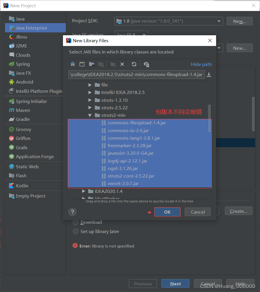File --> New --> Project 。选择Java Enterprise,勾选Web Application 和Struts 2。下面Libraries -->Use library–>Create,选择自己的Struts2的jar包–>OK。next,输入项目名称,完成。