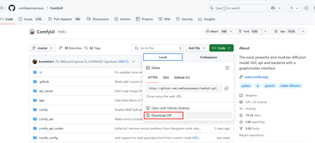 https://github.com/comfyanonymous/ComfyUI用你熟悉的方式进行软件下载,或者直接把压缩包下载到本地,解压就可以。