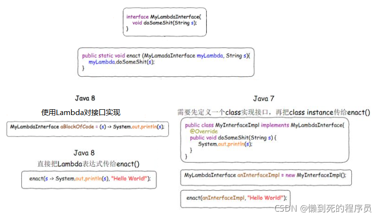 Lambda表达式能赋值给一个变量,也就能当作参数传给函数。这个Lambda形式的变量/参数的类型是它所实现的那个接口,所包含的方法体便是这个接口抽象方法的实现。以后看到调用方法的参数是一个SAM类型接口的时候就可以考虑使用Lambda表达式替换匿名内部类来写。