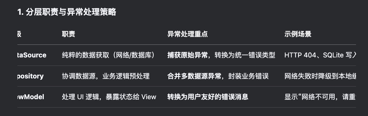 不要在生产数据的 DataSource 中内部消化,而是在提供数据的 Repository 中,这里能解决网络失败后从缓存中读取。处理了异常,返回的都是可空类型,外层只需要处理为null的情况)。