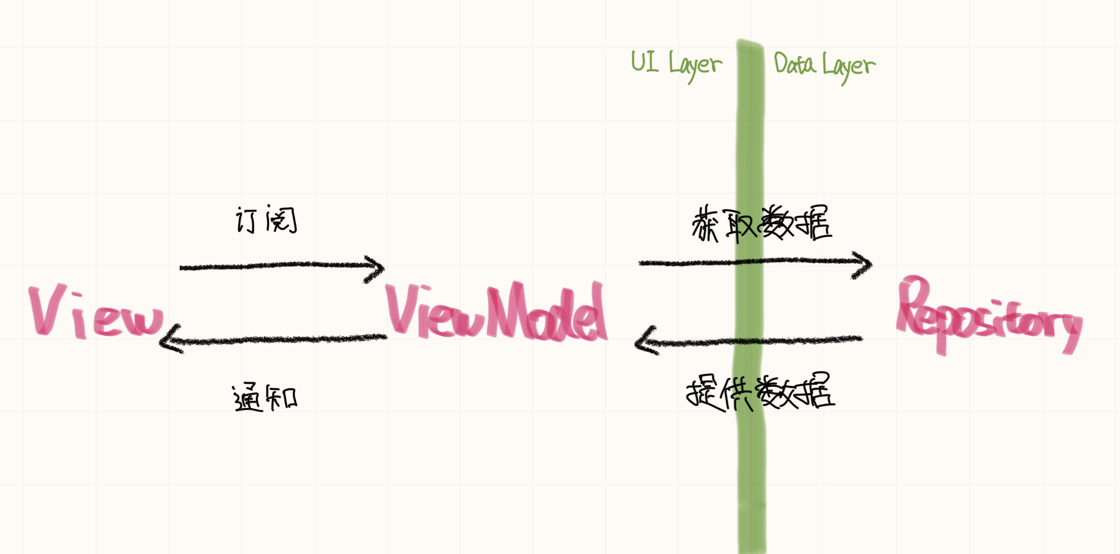 | 通信 | View→ViewModel:View作为观察者,监听ViewModel中数据(LiveData、Flow)的变化从而自动更新UI。 ViewModel→Model:ViewModel调用Model获取数据。 ViewModel→View:ViewModel作为被观察者,当数据发生变化时,调用接口通知订阅者View更新。 |