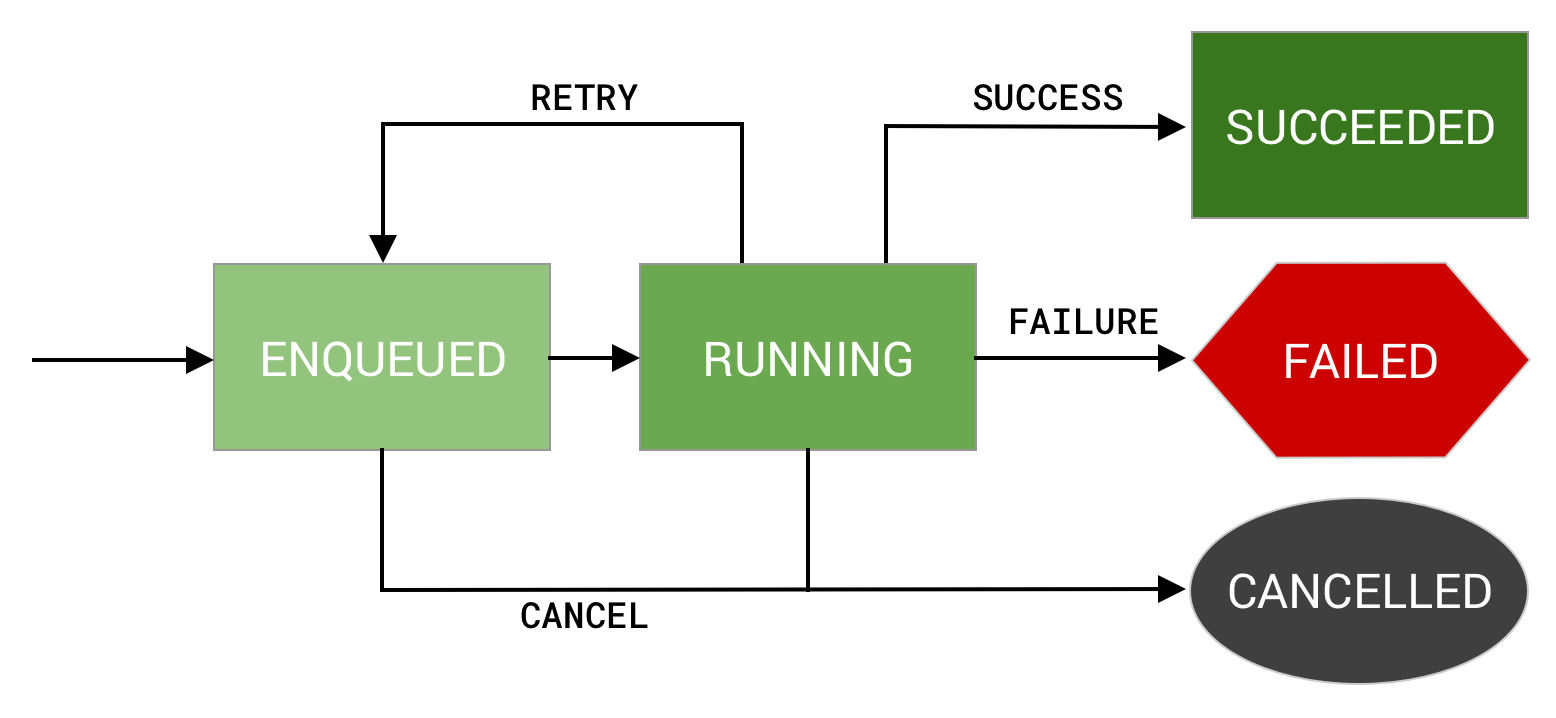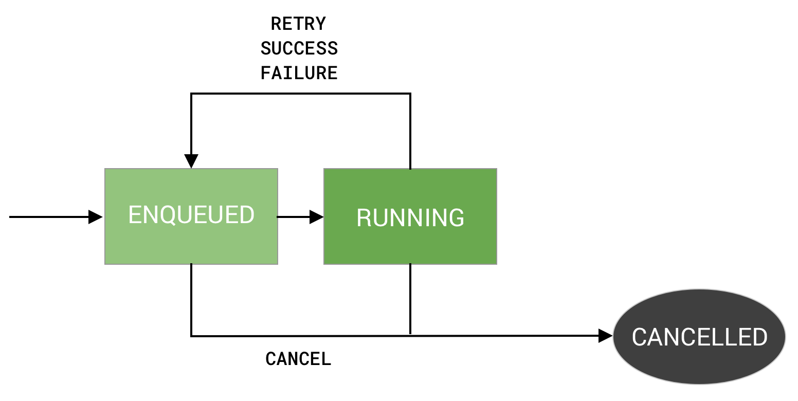 单次任务的初始状态为 ENQUEUED,任务会在满足其 Constraints 和初始延迟计时要求后立即运行。接下来,该任务会转为 RUNNING 状态,然后可能会根据任务的结果转为 SUCCEEDED、FAILED 状态;或者,如果结果是 retry,它可能会回到 ENQUEUED 状态。在此过程中,随时都可以取消任务,取消后任务将进入 CANCELLED 状态。
