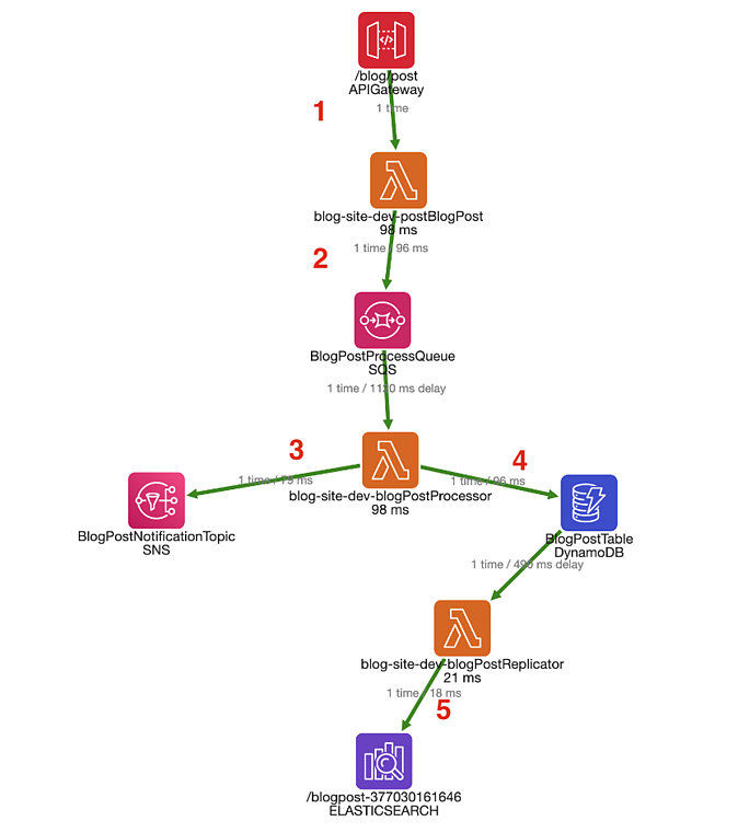 博客应用程序设计为无服务器范式,并分解为许多小的Lambda函数,它们的责任很小,特权最少。当第一个请求进入系统时,异步调用链从Lambda函数之间流动的事件开始。这称为“业务流”,它表示有意义的调用链,这些调用可以为软件用户实现真正的工作。例如,当作者提交博客帖子时,便开始了使该博客帖子准备好进行审阅的业务流程。