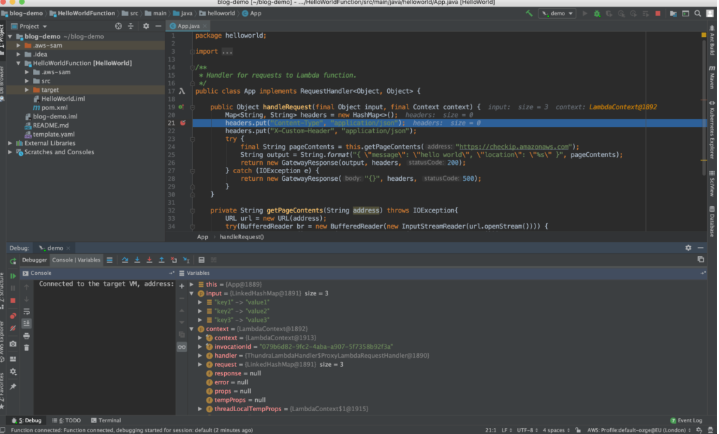 由于开发人员无法访问基础架构,因此他们现在调试无服务器应用程序所需的唯一资源就是调用后打印的日志。但是,编写新的日志行,部署功能并再次检查日志需要花费大量时间。分步调试,设置断点和检查变量可以提高开发人员效率。在某种程度上,AWS Toolkit和SAM使您可以轻松地在本地环境上执行逐步调试。但是,由于权限,触发器和VPC配置的原因,很难在本地重新创建相同的AWS环境。有时,在不进行实时调试的情况下对问题进行故障排除可能既复杂又耗时。但是,能够在IDE上传统调试的舒适度下使用逐步调试实时功能,是完成该任务的便捷方法。