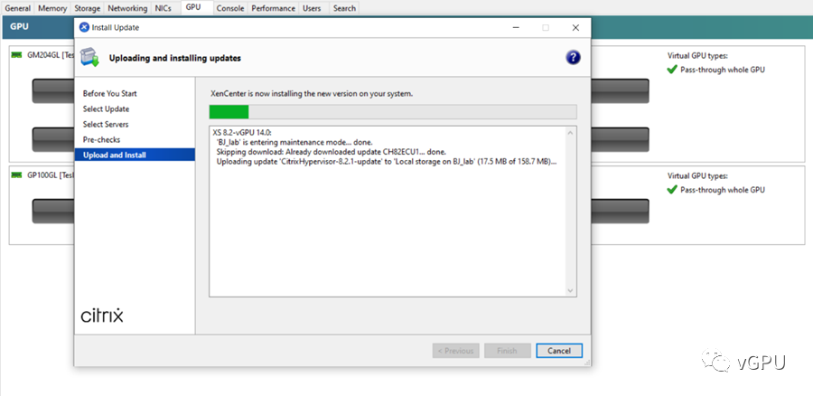 但是升级完了以后你会发现此时的Citrix Hypervisor仅支持GPU直通(此时Citrix Hypervisor已经正常授权),不支持vGPU功能。经过确认发现需要升级到Citrix Hypervisor到8.2.1 才可以支持14.0的vGPU功能。