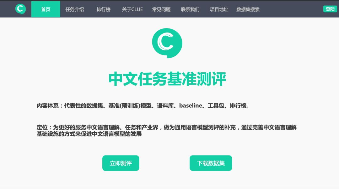 这就促成了一个更全面的组织 CLUE ,CLUE 为 Chinese GLUE 的缩写,这是一个为中文语言理解提供评估基准的开源组织,他们关注的方向有:任务和数据集,基准,经过预训练的中文模型,语料库和排行榜发布。