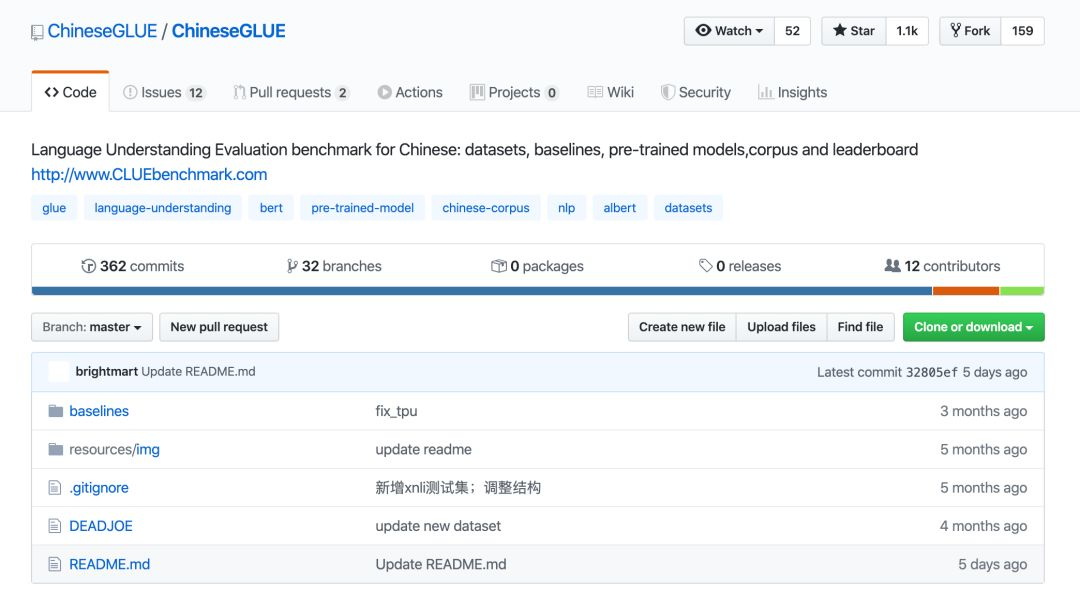 2019 年 12 月 11 月底,该项目迁移至更全面的更多技术支持的项目:CLUEbenchmark/CLUE。