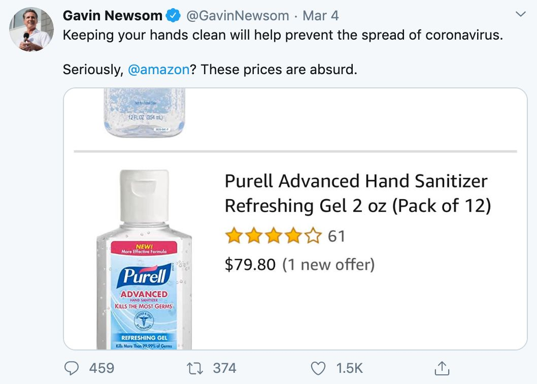 一位用户在 3 月 4 日发推特对某商品价格表示强烈质疑。他发布的商品截图上显示,一小瓶 Purell 洗手液定价为 79.80 美元,24 包 Purell 定价为 400 美元。网友回复应该有相关法律来约束。