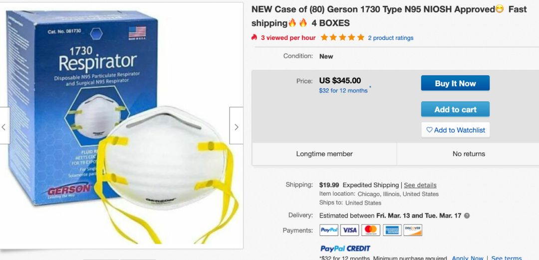 在 eBay 宣布之前,一盒 20 包的 Gerson 1730 口罩价格高达 148 美元,而一包 5 个 2.5 盎司(约 70 克)的 Germ-X 洗手液价格高达 500 美元,相比之下,沃尔玛同款洗手液两瓶 30 盎司仅售 8 美元。此后,eBay上的商品已被删除。