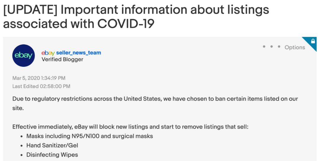 2 月 28 日,eBay 向商家发布了公告,声明在商品描述中,禁止包含健康声明、滥用术语的标题以及项目描述,例如「冠状病毒」,「Covid-19」,「病毒」,「流行病」。