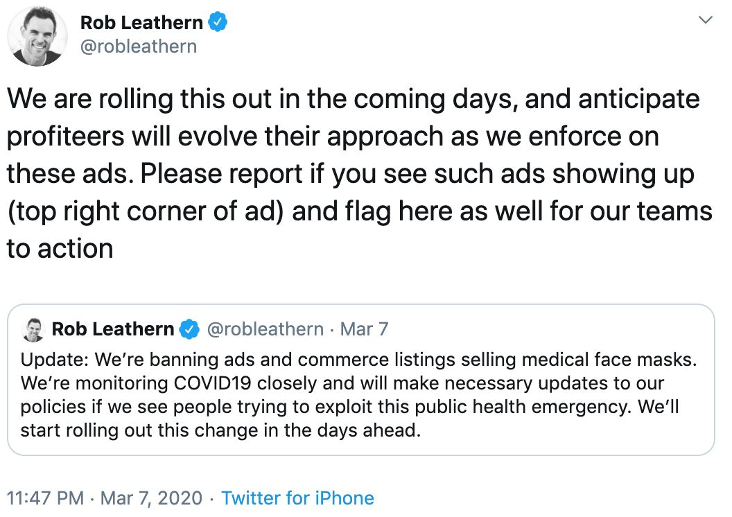 「我们正在密切关注 COVID19,如果看到有人试图利用这一公共卫生紧急情况,我们将对政策做出必要的更新,」Rob Leathern 在 Twitter 上更新道,「我们将在未来几天开始强制执行这类广告的临时禁令。」