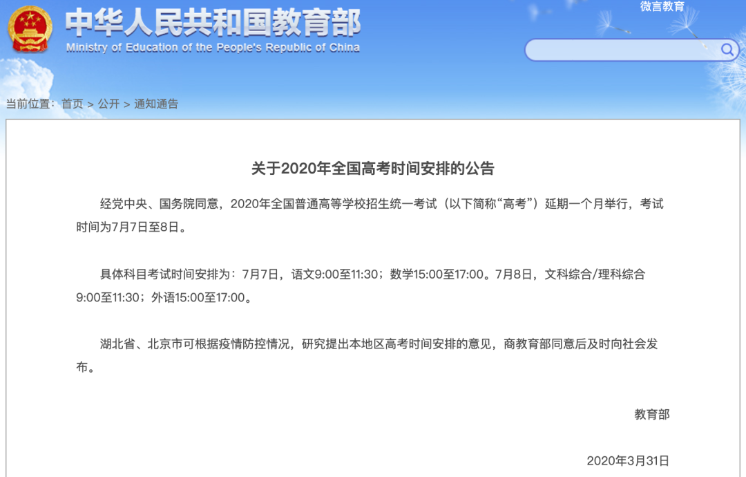 3 月 31 日,教育部发布通知,经党中央、国务院同意,2020 年全国普通高等学校招生统一考试(以下简称「高考」)延期一个月举行,考试时间为 7 月 7 日至 8 日。