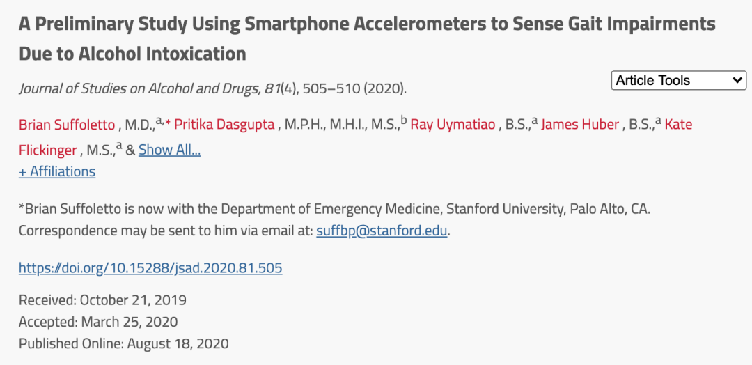 近日,他所带领的团队在《酒精与药物研究杂志》(《Journal of Studies on Alcohol and Drugs》)发表了最新研究《A Preliminary Study Using Smartphone Accelerometers to Sense Gait Impairments Due to Alcohol Intoxication》,介绍了使用智能手机检测是否醉酒的方法。