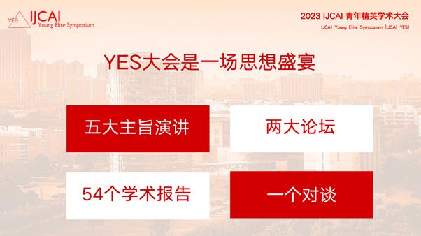 IJCAI YES 全称 IJCAI Young Elite Symposium,青年精英学术大会,第一届于 2021 年在上海召开,旨在通过为年轻人提供展示前沿工作、向行业专家学习以及与志同道合的同行合作的平台, 以培养下一代人工智能研究者、创新者和企业家,同时加强学术领域的国际交流,促进人工智能在整个亚太区域的普及和发展。