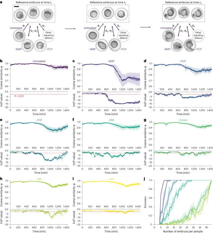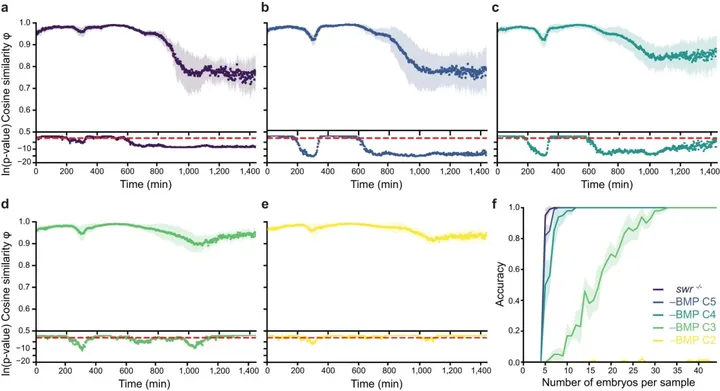 对时间点进行统计分析,确定胚胎群体与参考群体显著偏离的时间点,从而检测到具有表型缺陷的胚胎群体,检测的准确性取决于分析的胚胎数量和干扰类型。
