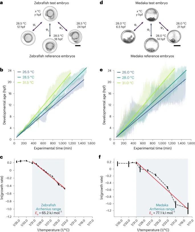 · 使用孪生网络量化分析温度依赖的发育速率,利用 Arrhenius 方程拟合数据。在物种特定的温度范围内,线性拟合的斜率给出斑马鱼和米达卡的表观活化能分别为 65 kJ/mol 和 77 kJ/mol。这些表观活化能与其他变温动物(如青蛙、果蝇或酵母)相似,明显不同于恒温动物(如小鼠或人类)。