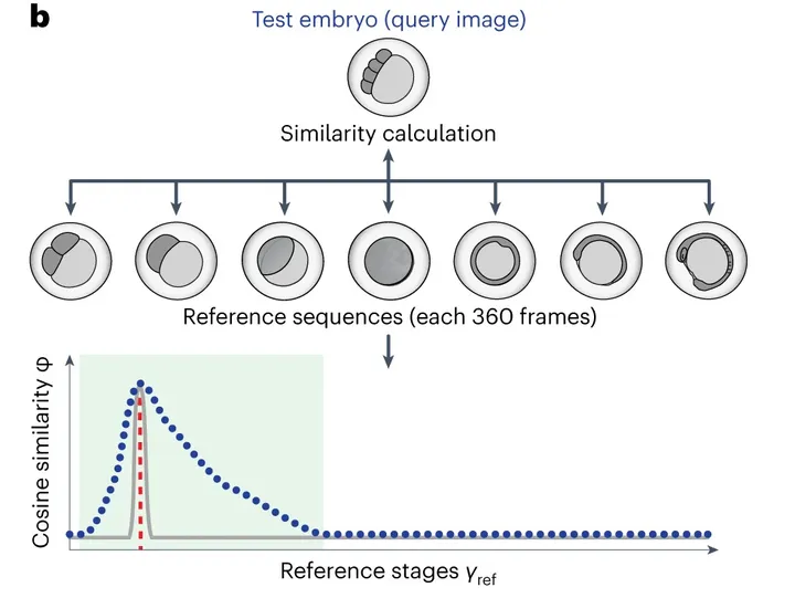 将测试图像与一组胚胎图像比较,计算它们之间的余弦相似度,获得相似性评分以分类胚胎图像。