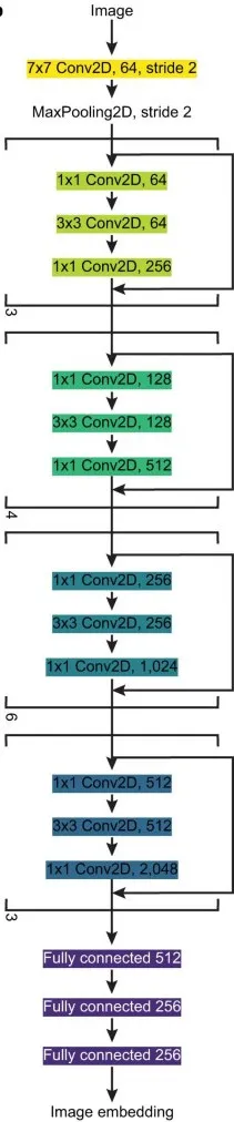 迁移学习:除了卷积块5和模型头层之外,ResNet50 骨干网络的所有层都被冻结。将 ResNet50 生成的特征嵌入结合在一个距离层中,计算训练过程中不同输入的网络生成嵌入之间的欧几里得度量。