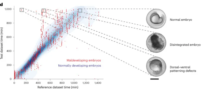 在 300 多万多张斑马鱼胚胎图像数据中,约有 1% 的胚胎发育异常,常见原因是自发性崩解或背腹极性缺陷。使用孪生网络,研究人员能够在早期阶段就检测出发育异常的胚胎。这些异常胚胎在预测的正常发育范围之外表现出较低的平均相似性值。