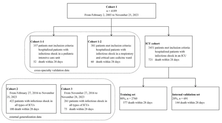 为了构建具有广泛适用性的感染性休克预测模型,研究团队整合了 3 家医院自 2003 年 2 月到 2023 年 11 月间,共计 4,872 名 ICU 感染性休克患者的临床数据,其参与者背景复杂多样,有助于研究团队开展多中心、跨专科验证,以证明模型的有效性和适用性。如下图所示: