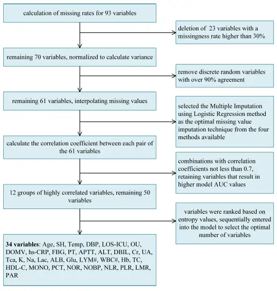 具体来看, 数据预处理共包含5 个部分:第一步,研究团队首先通过缺失率计算,删除了缺失率高于 30% 的 23 项变量;第二步,根据伯努利方差公式(Bernoulli’s variance formula)计算布尔特征(Boolean Features)的方差,再次移除一致性超 90% 的离散随机变量;第三步,通过缺失值插值方法(Logistic 回归多重插补)进一步优化至 61 项变量;第四步,再次进行高相关性特征筛选(Pearson 相关系数 ≥0.7),此时还剩 50 个变量。如下图所示: