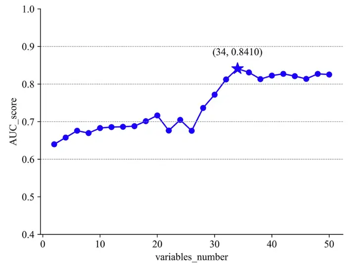 基于信息熵排序,当变量数为 34 时最优,此后 AUC 不再随变量数量增加获得增益