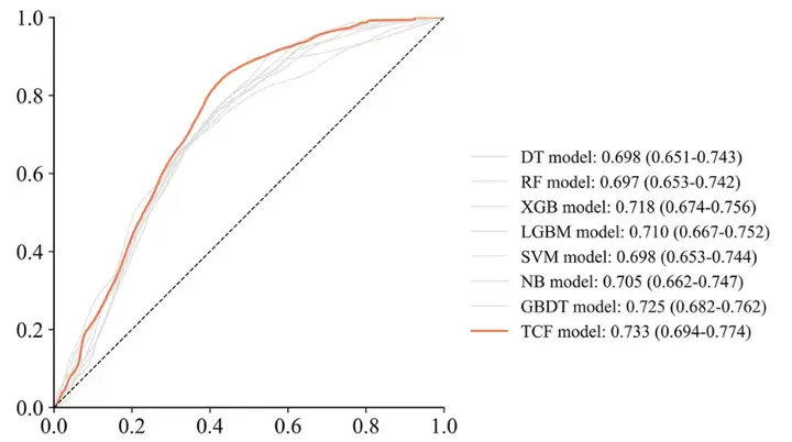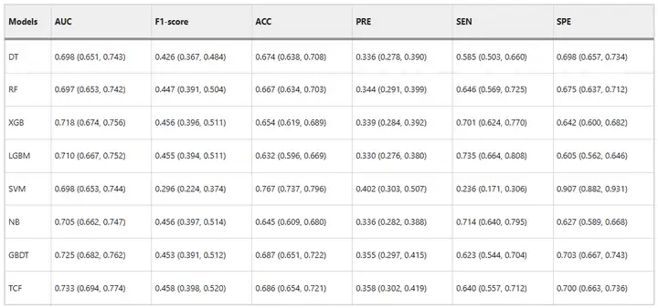 TCF 在内部验证集上的 2 个综合评价指标上均优于子模型,AUC 为 0.733,F1-score 为 0.458 。此外,ACC 为 0.686 和 PRE 为 0.358 也高于多数子模型。这显示出其具有出色的分类能力。