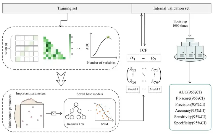 * 研究采用高效的融合策略,构建了一个基于多基本分类模型的高泛化能力和鲁棒性的融合模型,克服了小样本队列和单一分类模型在临床场景中性能不佳的问题