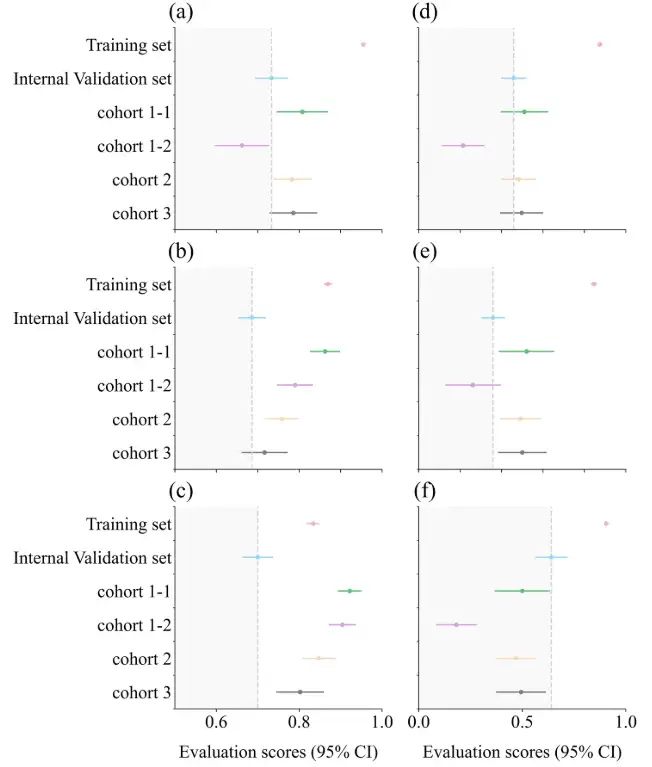 其中,a 为 AUC 箱线图;b 为 ACC 箱线图;c 为 SPE 箱线图;d 为 F1-score 箱线图;e 为 PRE 箱线图;f 为 SEN 箱线图。灰色虚线表示内部验证集的结果,其他数据集的评估分数落在深灰色区域内,表明与内部验证集相比性能下降。