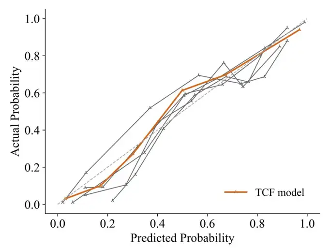 校准曲线 和 Decision Curve Analysis(DCA)曲线表明了 TCF 模型的预测结果与实际结果一致。首先,TCF 模型的校准曲线最接近对角线,这表明它在所有模型中具有最佳的校准性能;其次,TCF 模型的曲线在大多数 阈值 概率下始终优于「All」和「None」策略,尤其在 0.1 到 0.5 的概率范围内展现出更高的净收益。这表明 TCF 模型在一定范围内具有潜在的临床应用价值,可以帮助临床医生做出更有利的决策。