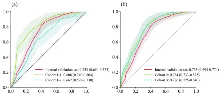 可见,与大多数研究中多中心预测效果略低于训练集和内部验证集的预测效果不同,在本次研究中,除 cohort 1-2(呼吸 ICU 患者数据集)的 AUC(0.662)略有下降外,cohort 1-1(儿科 ICU 患者数据集)、 cohort 2 和 cohort 3 的 AUC 均有改善,分别为 0.808 、 0.784 和 0.786 。