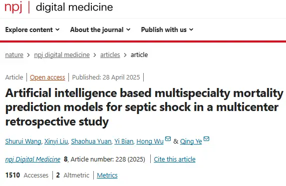 研究成果以「Artificial intelligence based multispecialty mortality prediction models for septic shock in a multicenter retrospective study」为题,发表于 Nature 子刊 npj digital medicine 。