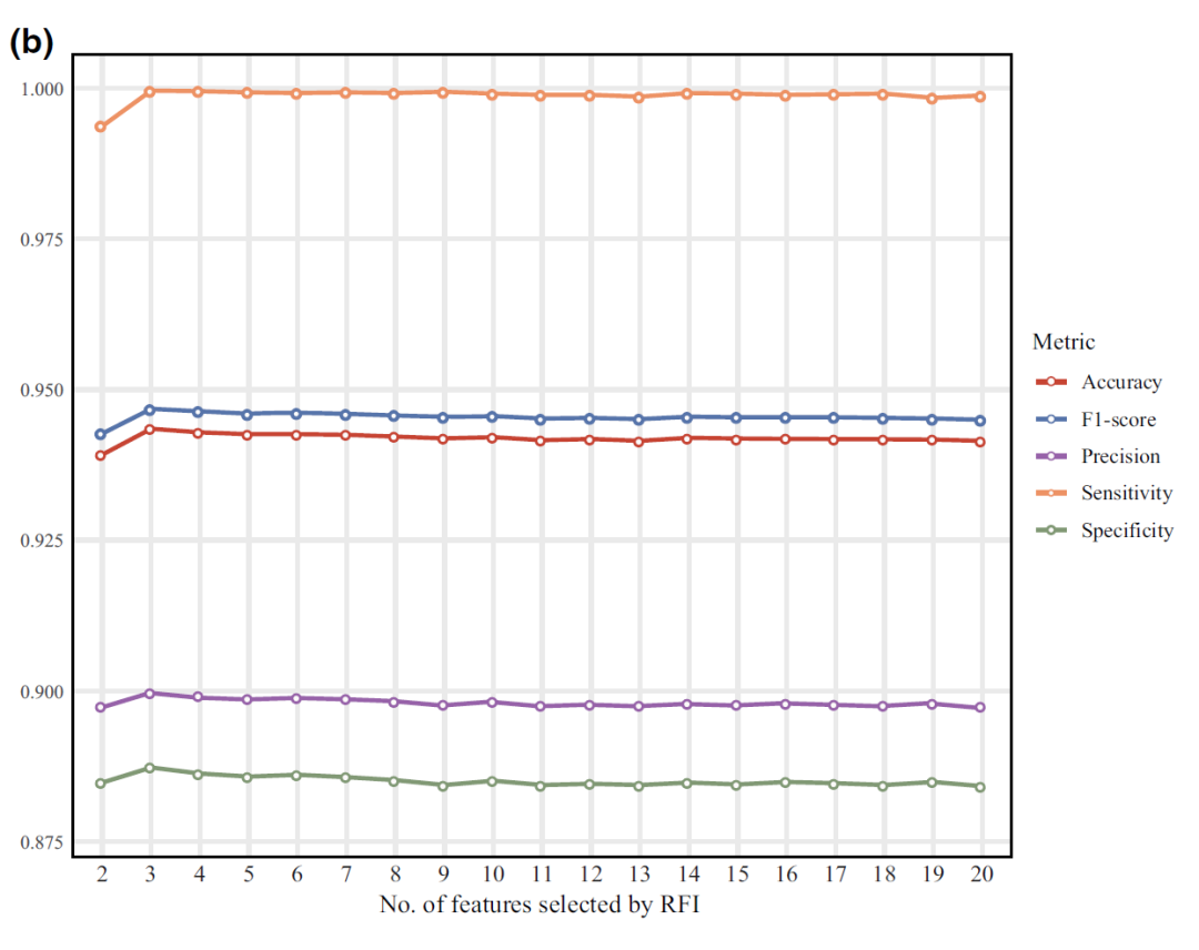 研究团队进一步通过逐次模型评估(Model evaluation)前 1-20 位特征的模型表现,如下图所示,发现仅 RFI-3 模型的 ORF 覆盖率、复数傅里叶平均值和原子傅里叶振幅时,模型性能达到峰值,准确率和 F1 分数分别达到 94.35% 和 94.68% 。值得注意的是,当特征数量超过 3 个时,模型性能显著下降,这验证了 “轻量特征集” 的有效性。