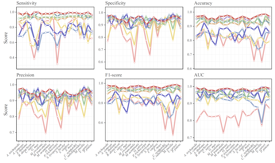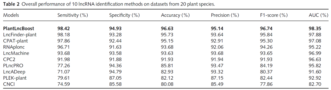 最终,PlantLncBoost 模型整合了 CatBoost 算法的高效学习能力和三大核心特征的判别优势。在十折交叉验证中,该模型以 94.35% 的准确率、 99.96% 的灵敏度等关键指标,超越了现有的 LncFinder-plant 和 CPAT-plant 等主流工具。 PlantLncBoost 形成了「轻量特征集 + 高性能算法」的创新架构,为植物 lncRNA 的精准鉴定提供了兼具生物学可解释性和工程实用性的解决方案,满足了大规模基因组数据分析的需求,并为植物 lncRNA 的跨物种精准鉴定提供了一个强大的新型工具。