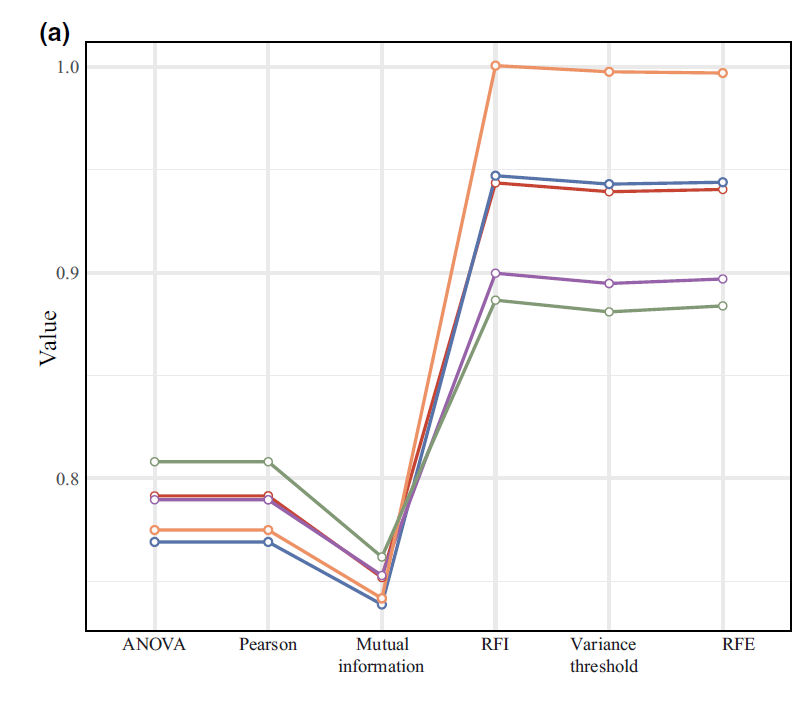 在特征选择(Feature selection)阶段,研究团队采用随机森林重要性(RFI)策略从 1662 个候选特征中筛选核心变量。通过这种方法构建的模型在五折交叉验证中实现了 94.21% 的准确率和 94.56% 的 F1 分数,远超基于方差分析等传统过滤方法的模型(准确率 75%-79%)。