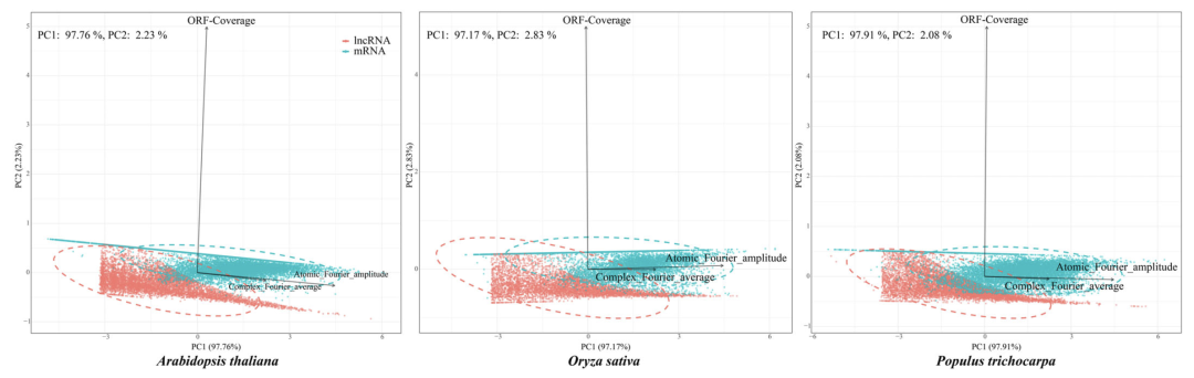 ORF 覆盖率作为一种经典的生物学特征,利用了 lncRNA 与 mRNA 在开放阅读框比例上的本质差异。例如,在拟南芥中,lncRNA 的 ORF 覆盖率峰值约为 0.2,而 mRNA 的 ORF 覆盖率则高达 0.7 。如下图所示,这一特征为模型提供了基础的区分能力。而复数傅里叶平均值和原子傅里叶振幅则是基于傅里叶变换的创新数学特征,通过复数编码和原子数编码技术捕捉序列的频域信号与结构特征。在拟南芥(Arabidopsis thaliana)、水稻(Oryza sativa)、杨树(Populus trichocarpa)等模式植物的主成分分析中,这两个特征主导的第一主成分解释了 97% 的分类方差,与 ORF 覆盖率贡献的第二主成分形成互补,共同构建了一个跨物种稳健的区分维度。
