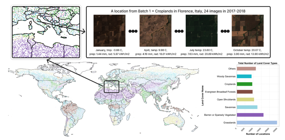 该数据集包含超过 290 万张卫星图像,包括 RGB 影像以及特定的多光谱通道数据。数据图像均来自哥白尼哨兵卫星任务,涵盖多种土地覆盖类型和多个时间点,训练集有 98,930 个不同地理位置,测试集包含 5,494 个位置。每张图像的每个时间戳都配有相关的天气元数据,如温度、太阳辐射和降水信息。