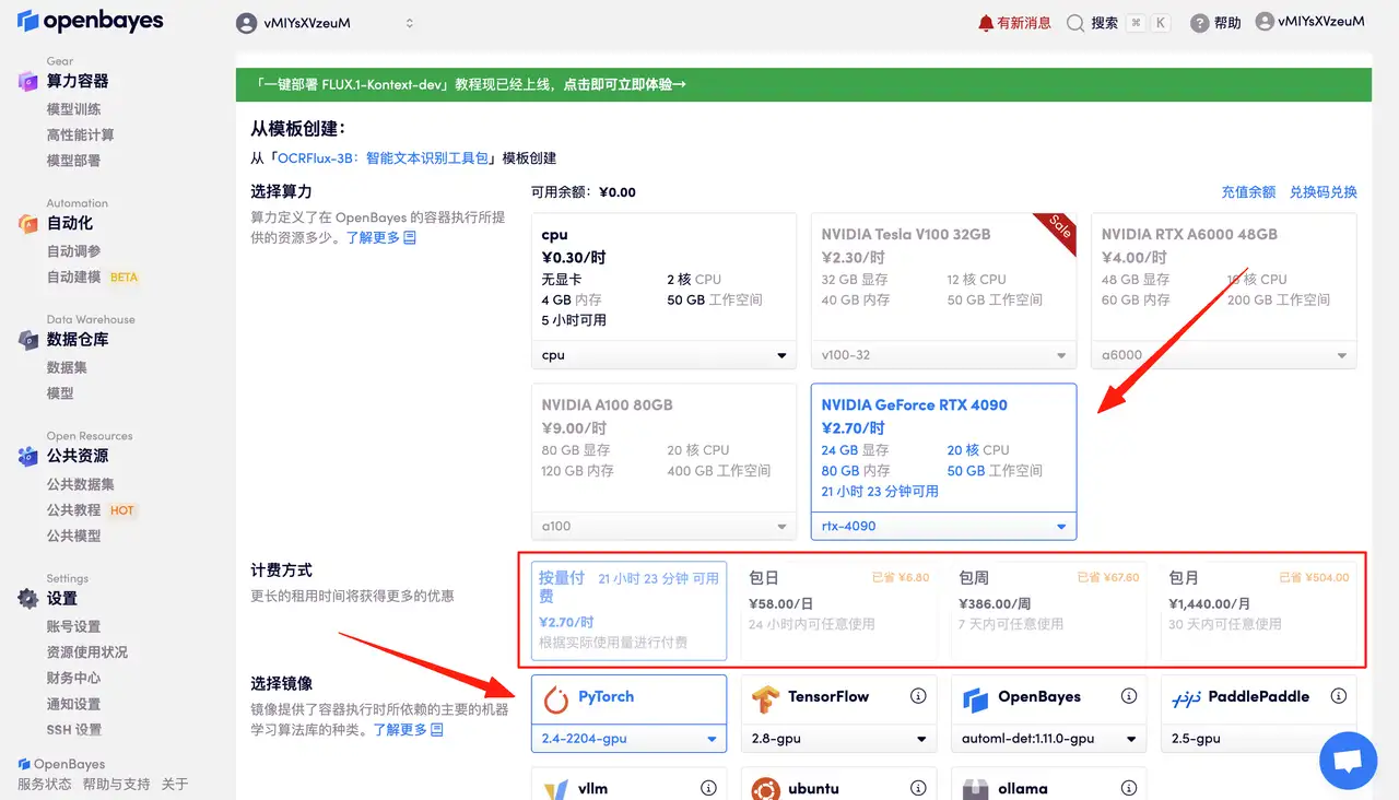 3. 选择「NVIDIA GeForce RTX 4090」,OpenBayes 平台提供了 4 种计费方式,大家可以按照需求选择「按量付费」或「包日/周/月」。在选择镜像「PyTorch」后,点击「继续执行」。新用户使用下方邀请链接注册,可获得 4 小时 RTX 4090 + 5 小时 CPU 的免费时长!