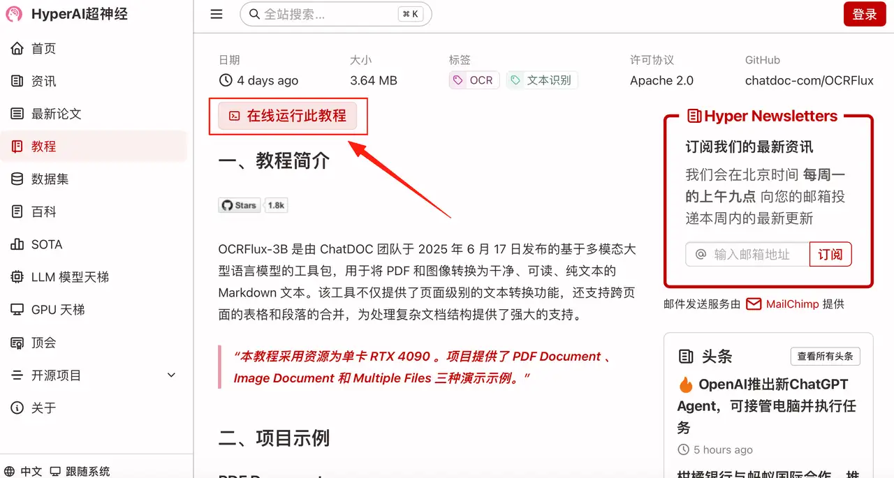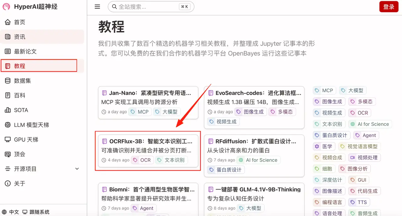 1. 进入 hyper.ai 首页后,选择「教程」页面,并选择「OCRFlux-3B:智能文本识别工具包」,点击「在线运行此教程」。