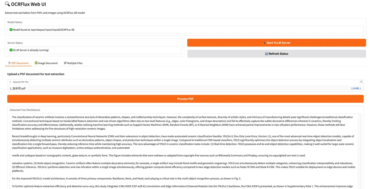 目前,「OCRFlux-3B:智能文本识别工具包」已上线至 HyperAI 超神经官网(hyper.ai)的教程板块,一键部署即可在线体验将 PDF Document 、 Image Document 和 Multiple Files 转换为可检索的 Markdown 文本,快来体验吧~