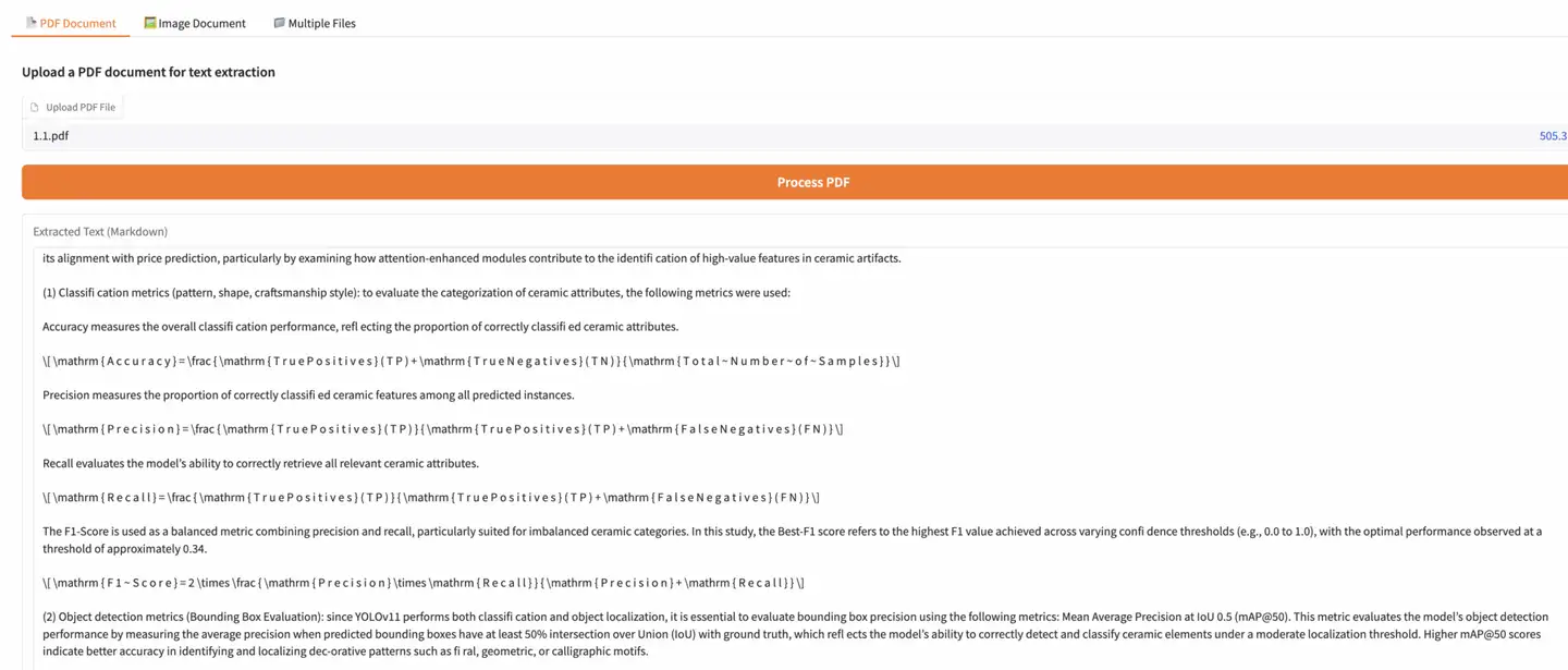 点击 API 地址即可进入 demo 页面体验该模型。进入模型页面后,上传 PDF Document / Image Document / Multiple Files 并点击「Process」就能生成相应的 Markdown 文本,效果如下: