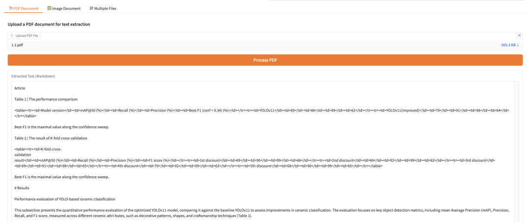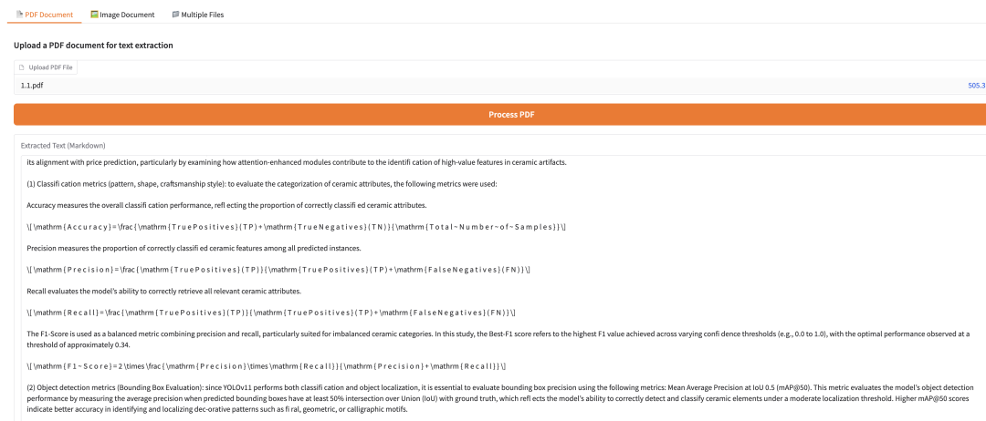 点击 API 地址即可进入 demo 页面体验该模型。进入模型页面后,上传 PDF Document / Image Document / Multiple Files 并点击「Process」就能生成相应的 Markdown 文本,效果如下:
